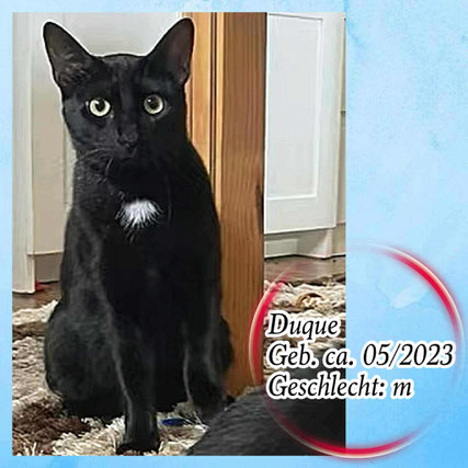 Update 28.01.2025: Duque ist mittlerweile vorsichtig und zurückhaltend bei Menschen. Hier wird er etwas Eingewöhnungszeit benötigen. Zu anderen Katzen ist er ruhig und sozial.